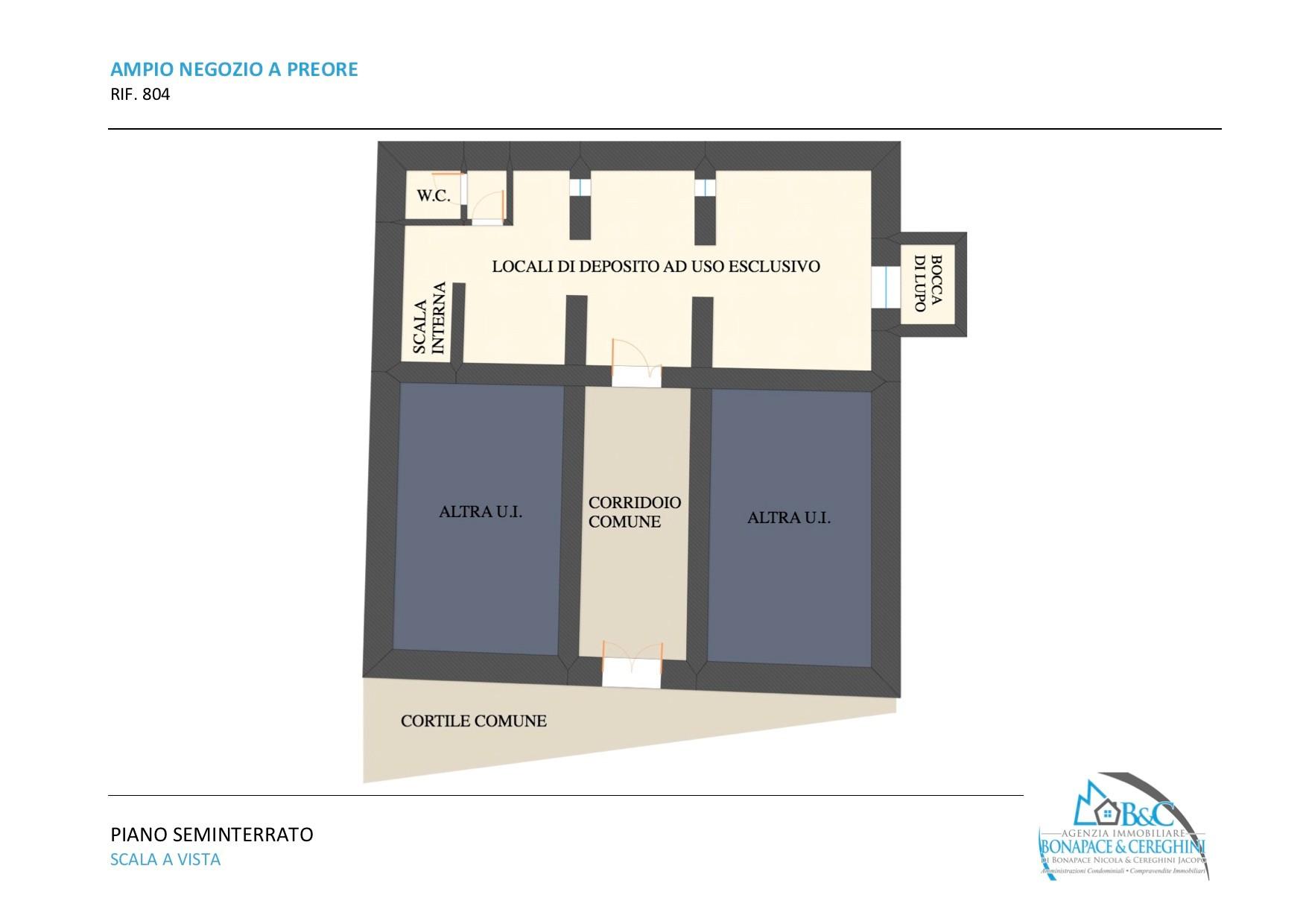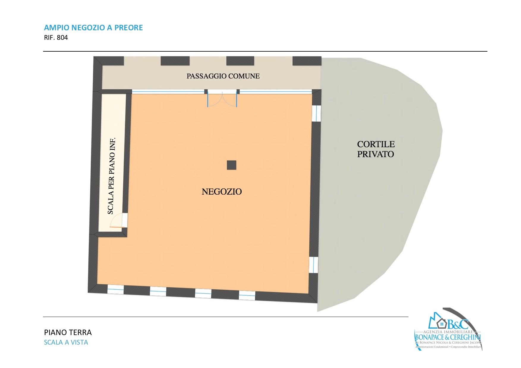 A Preore, in posizione di visibilità fronte strada principale, proponiamo in vendita un ampio e luminoso negozio di 143 metri quadrati. La proprietà è valorizzata dalla presenza di due comode cantine al piano seminterrato e da un piazzale esterno privato di 76 metri quadrati, utilizzabile come parcheggio. L'unità gode di doppio accesso: uno diretto dal porticato che affaccia sulla strada principale e l’altro secondario dal piano seminterrato. L'immobile è composto da un grande spazio commerciale privo di pareti divisorie, e quindi personalizzabile, una scala che collega al piano inferiore, un bagno di servizio, due cantine e l'ampio piazzale esterno. L'edificio è ben tenuto e curato nella sua parte esterna, garantendo buona visibilità e facilità di accesso. Ottima soluzione anche come ufficio, valutabile anche la possibilità di conversione in appartamento.